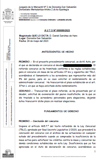 Nuestro cliente obtiene la exoneración de las deudas orginadas por la explotación de un negocio de hostelería. Tras someterse al procedimiento de Segunda Oportunidad se le condonan las deudas en las que incurió para sostener la actividad que se vió forzado a cerrar. Auto concesión Exoneración Pasivo Insatisfecho