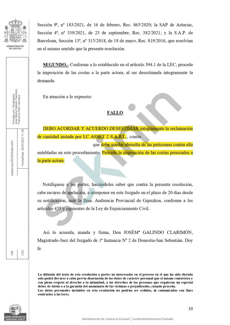 El Juzgado de 1ª Instancia Nº 2 de Donostia-San Sebastián ha emitido una sentencia en la que se declara perdedora a la entidad LC ASSET 2 S A.R.L. en un juicio monitorio contra nuestra clienta. La sentencia ordena el pago de las costas procesales a la entidad LC ASSET 2 S A.R.L. El proceso comenzó […]